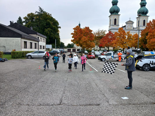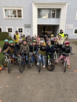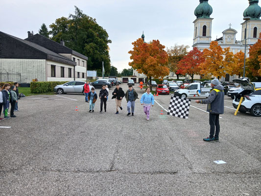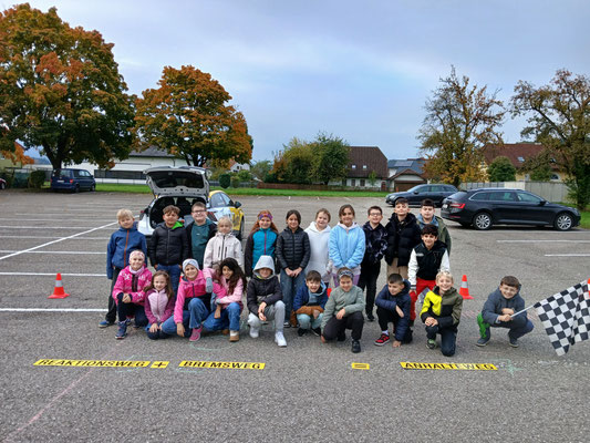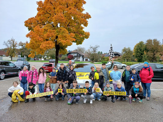 Beim Projekt "Hallo Auto" am Parkplatz in Puchheim konnten die Kinder der 3a mit dem eigenen Körper den Anhalteweg spüren. Zuerst haben sie beim Laufen ausprobiert, wie lange es dauert, bis man wirklich stehen bleibt. In einem umgebauten Auto durfte dann jedes Kind einmal die Bremse betätigen und somit den Anhalteweg auch in einem Fahrzeug erleben.