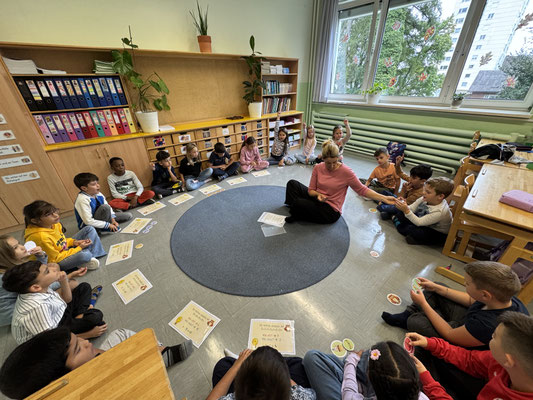Die Kinder der 3a haben mit ihren Patenkindern der 1a eine Rallye durchs Schulhaus gemacht. Am Ende hatten die "Großen" noch ein kleines Geschenk für jedes Patenkind.