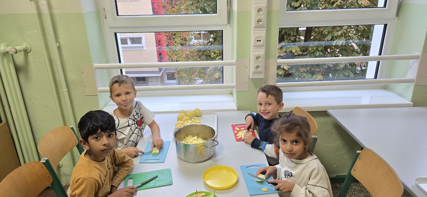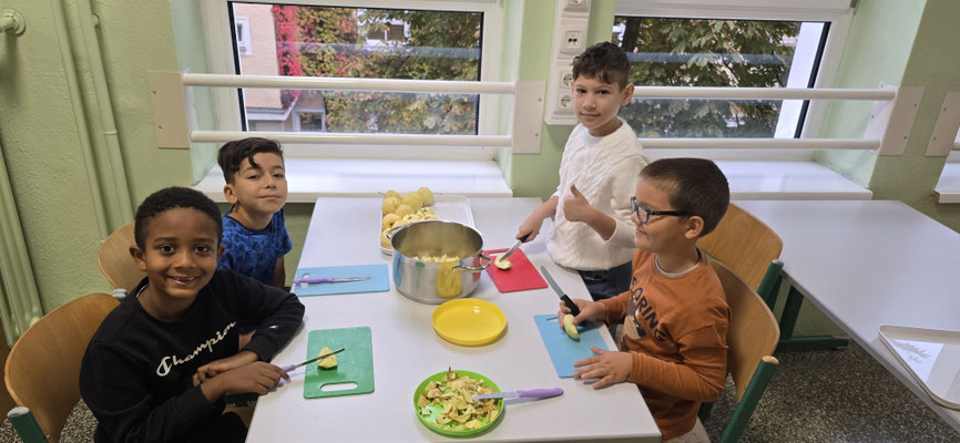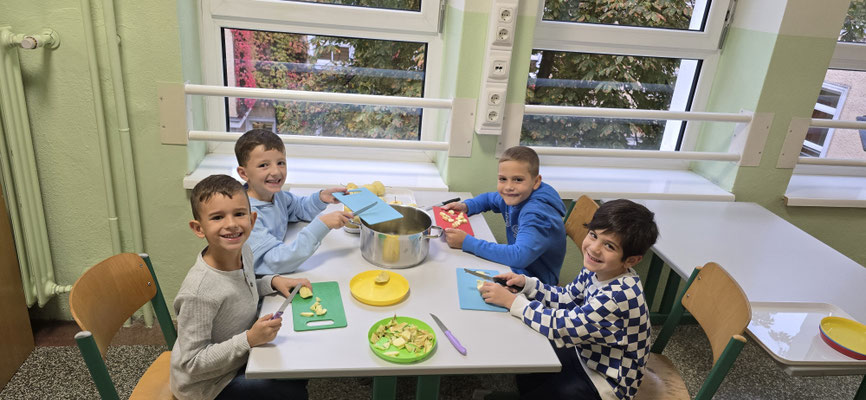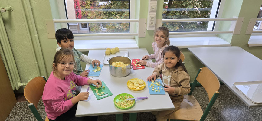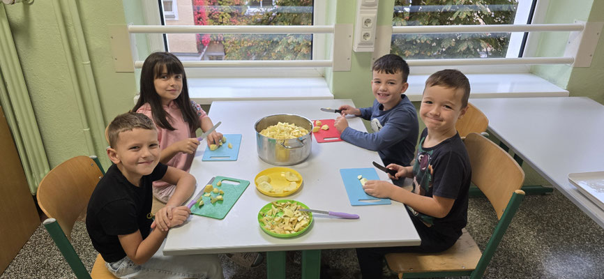 Die Kinder der 1b lernen die Apfelteile kennen und kochen gemeinsam Apfelmus.
