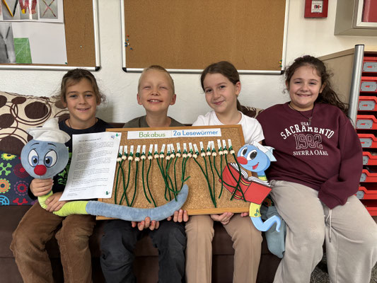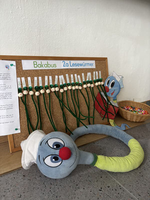 Die Kinder der 2a haben Post vom Lesewurm Bakabu bekommen. Ab sofort darf jedes Kind seinen eigenen Lesewurm großziehen - mit regelmäßigem Lesefutter in Form von Lesezeit. Als kleiner Begleiter durch die verschiedenen Leseabenteuer haben die Kinder auch ihr eigenes Lesezeichen gestaltet.